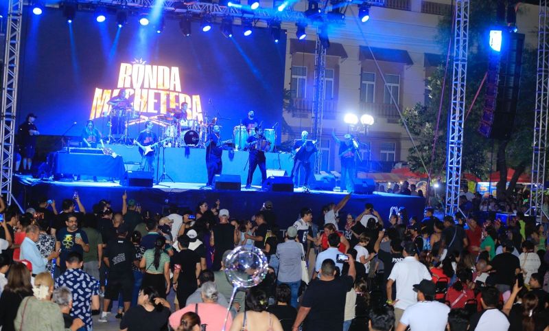 Simultáneamente, en la Plaza Juárez, el ritmo se apoderó de la noche con la presentación de La Ronda Machetera, agrupación nacida de la fusión de La Ronda Bogotá y Pato Machete, que rindió homenaje al inolvidable Celso Piña con un vibrante espectáculo de cumbia y hip hop.